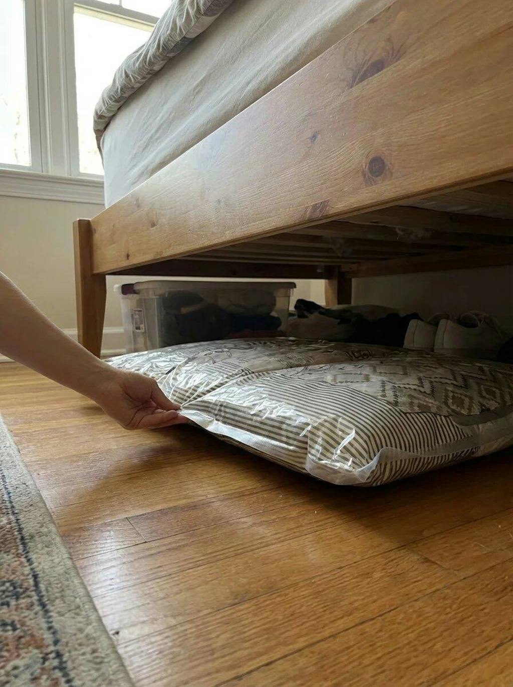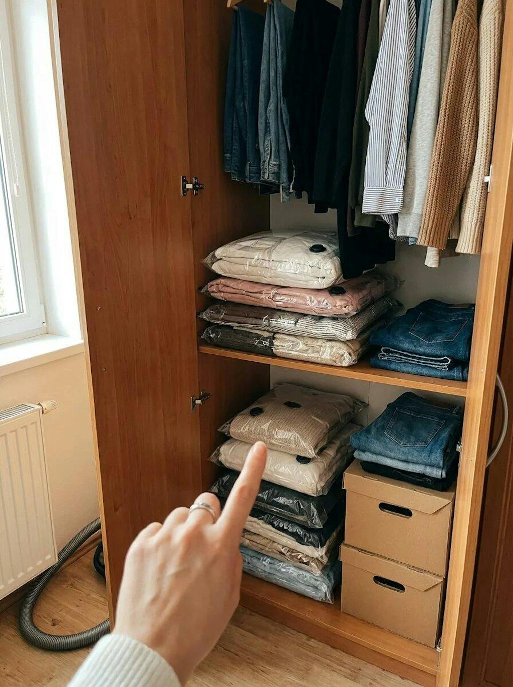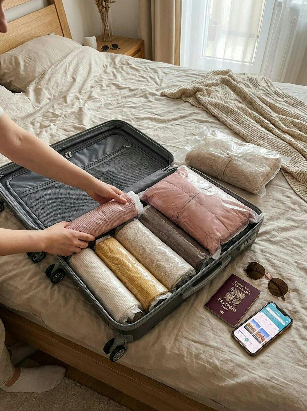 はい、最大約80%まで圧縮可能です。厚手の衣類や布団にも対応しています。